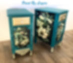 This vintage petite dresser with original beveled mirror dates to the 1930's. It is painted in a warm white and a slightly faded wildflower transfer has been added to the 3 drawers. New crystal glass knobs adorn the 3 drawers which are lined with a beautiful coordinating blue and white paper.I created decorative moulds to add interest to both sides and the base of the mirror arms. A blue raised damask design was also added to each side to add to the charm of this piece.